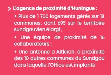 La création de cette nouvelle antenne de proximité permet ainsi aux équipes de l’agence d’Huningue d’accueillir les (actuels ou futurs) locataires du secteur dans un espace adapté. L’antenne ne dispose pas de personnel permanent, mais fonctionne sur un système de permanences et de rendez-vous avec les collaborateurs de l’agence (correspondants de sites, gardiens, conseillères logement et chargées de recouvrement), permettant ainsi aux sundgauviens d’être à moins de 30 minutes d’un point d’accueil de l’Office.
