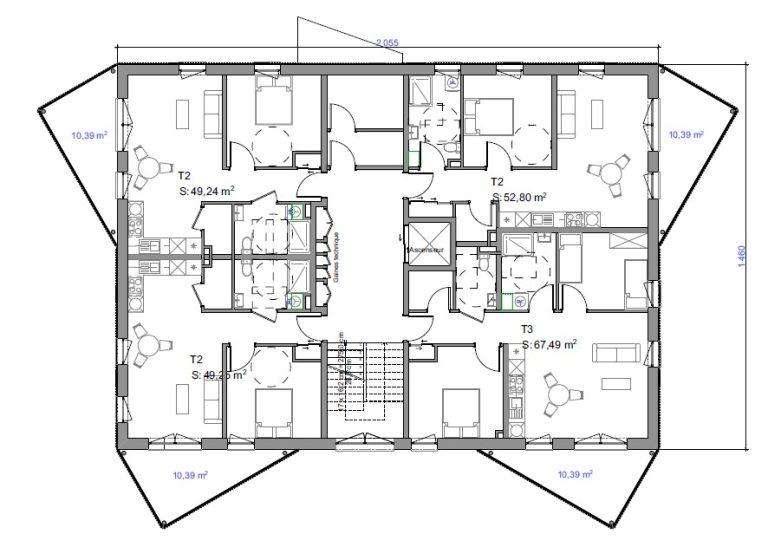 Plan d'étage de 3 T2 et 1 T3