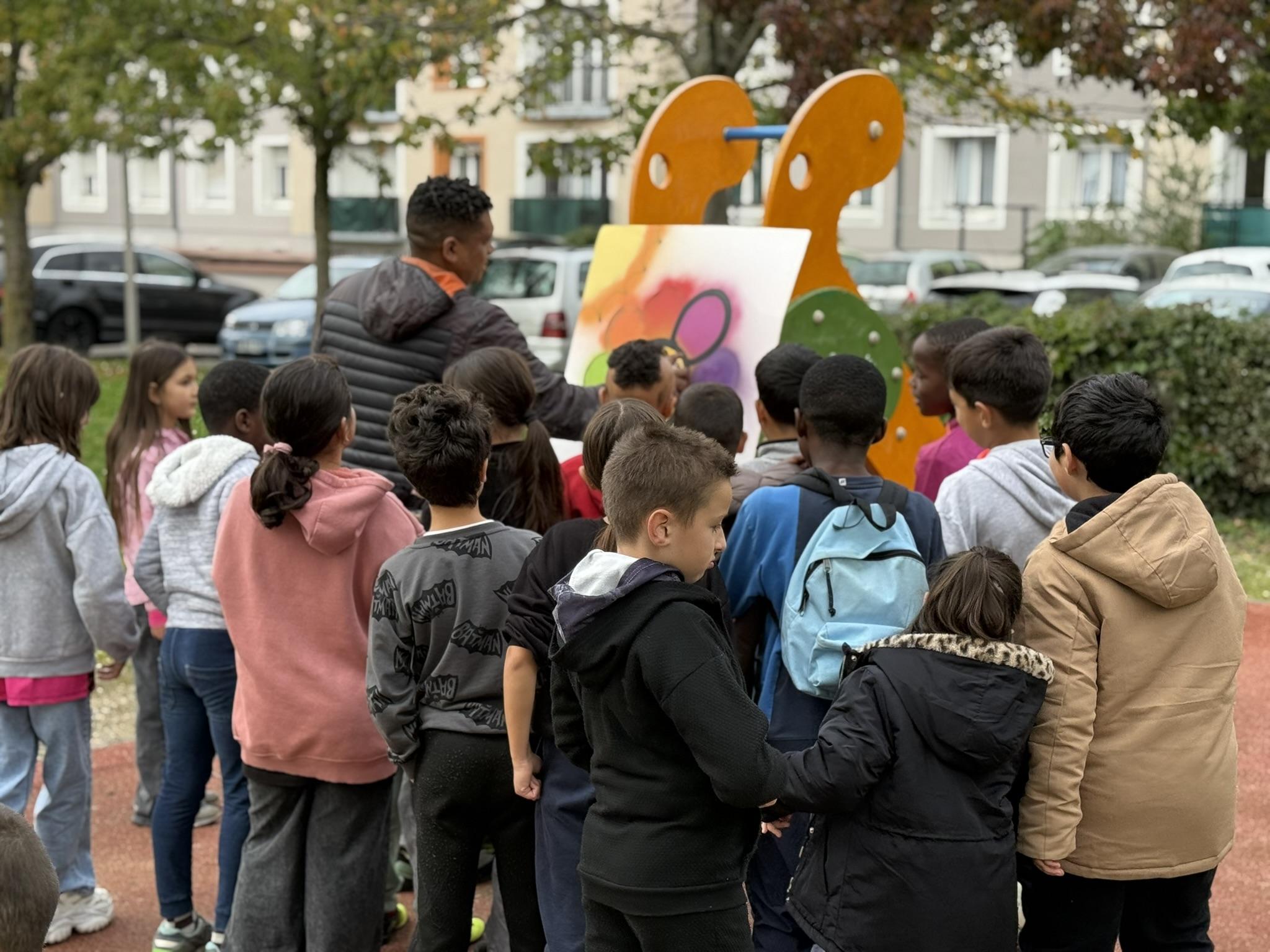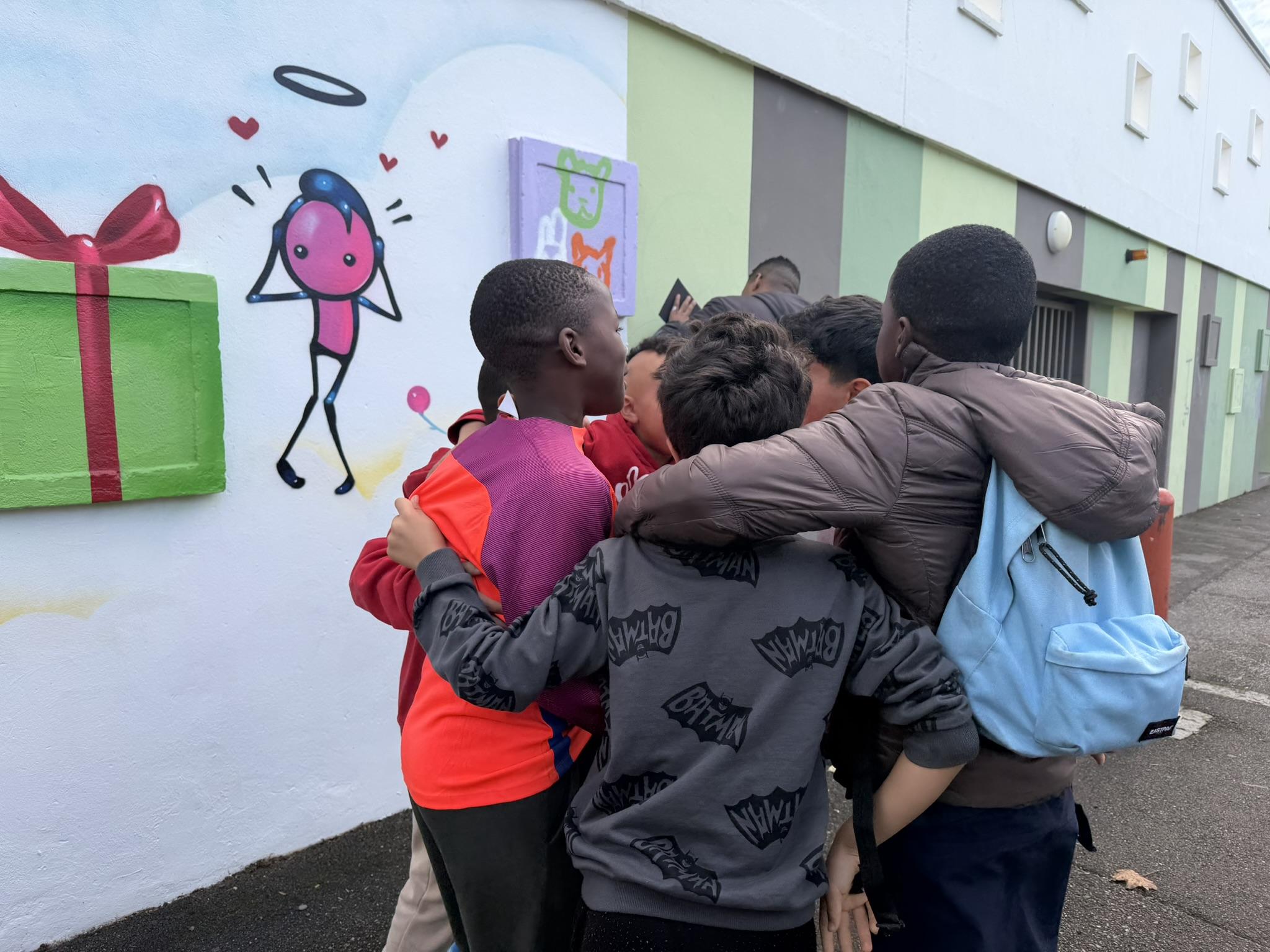 Du 27 au 31 octobre 2025, une fresque participative a ainsi été imaginée et réalisée par l’artiste brésilien Wark da Rocinha* et une vingtaine d’enfants du quartier : mer, soleil, football, animaux, cadeaux,… les enfants ont bombé leurs rêves dans les différentes cases du mur du silo à garages, situé en plein cœur du quartier Tivoli. Cet artiste engagé, dont les fresques colorées ornent de nombreux murs au Brésil, en Europe et en Asie, a mis son savoir-faire pédagogique au service d’une conviction partagée : les quartiers doivent être des espaces de culture, d’épanouissement et de fierté collective pour leurs habitants.