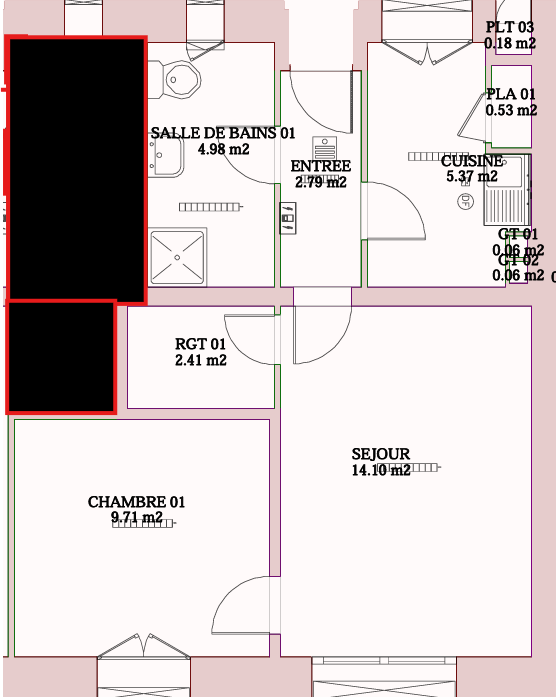Salle de bain (4.98m²), Entrée (2.79m²), Cave (3.8m²)