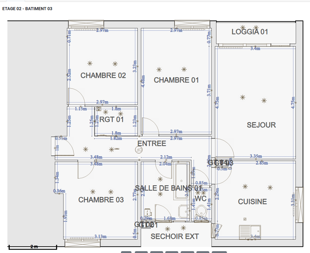 Salle de bain (5,1m²), W.C. 1 (1,2m²), Entrée (8,96m²), Loggia (2,91m²), Séchoir extérieur (2,95m²), Cave (2m²)