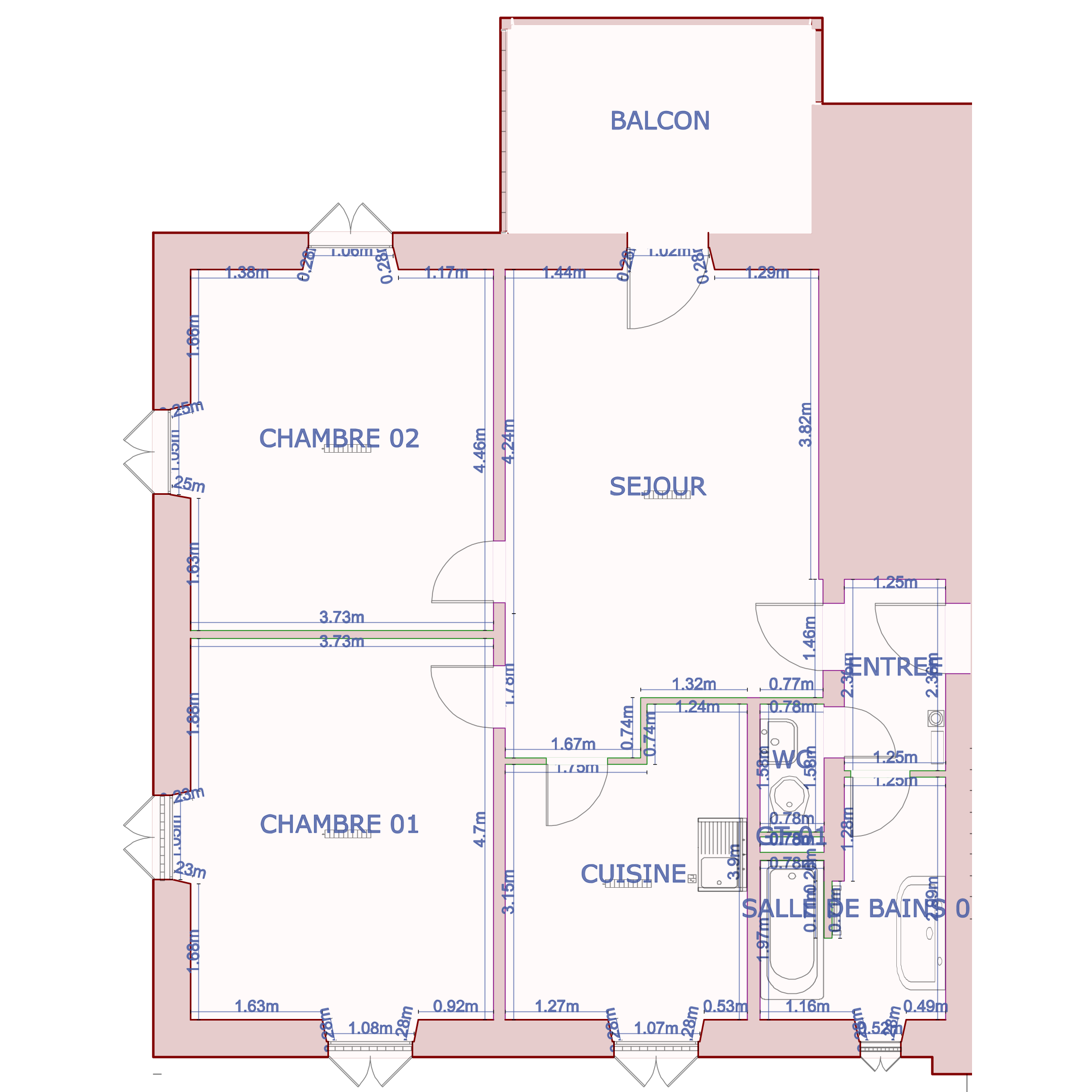 Salle de bain (5,8m²), W.C. 1 (1,24m²), Entrée (2,94m²), Balcon 1 (9,56m²)