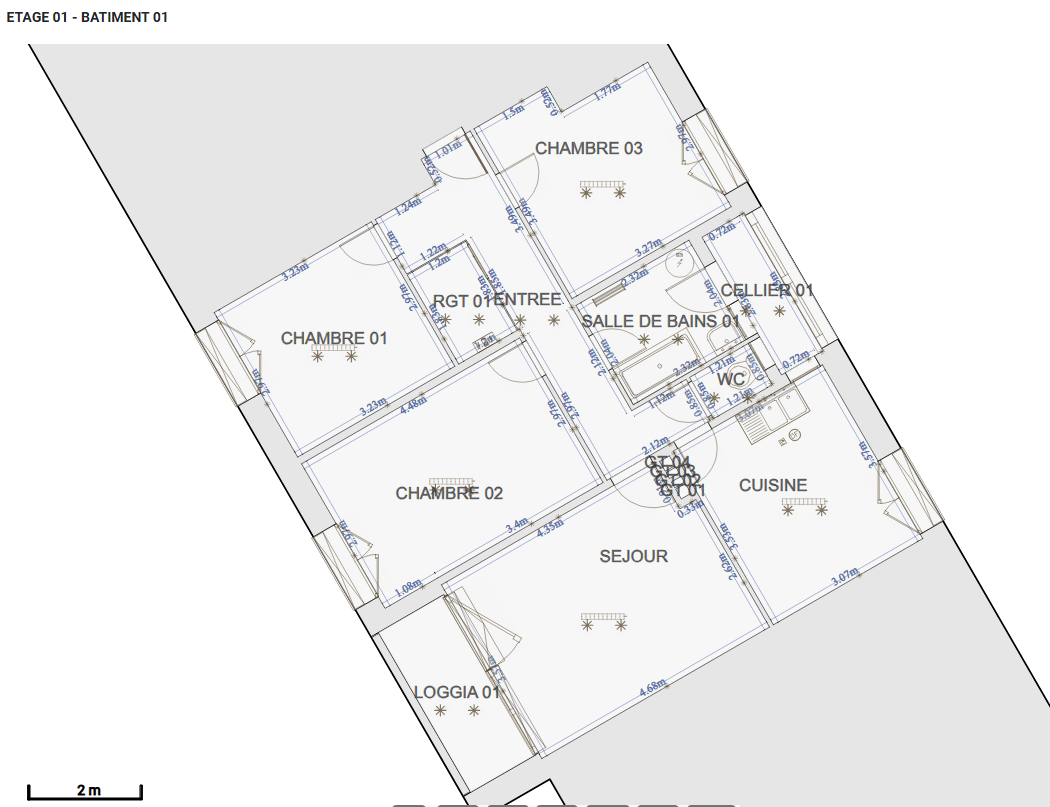 Salle de bain (4,73m²), W.C. 1 (1,03m²), Entrée (9,01m²), Cellier extérieur au logt (2,43m²), Loggia (4,35m²), Cave (2m²)
