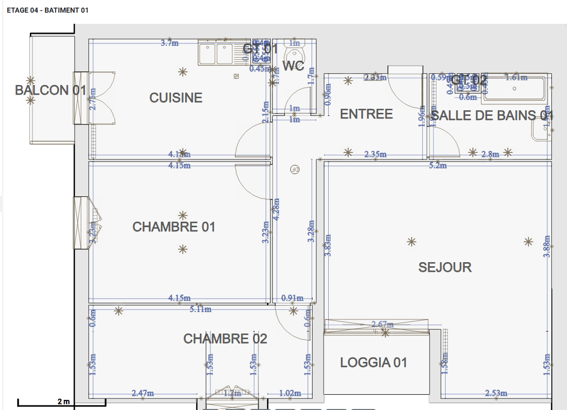 Salle de bain (5,22m²), W.C. 1 (1,7m²), Entrée (9,07m²), Loggia (3,36m²), Balcon 1 (2,45m²), Cave (2m²)